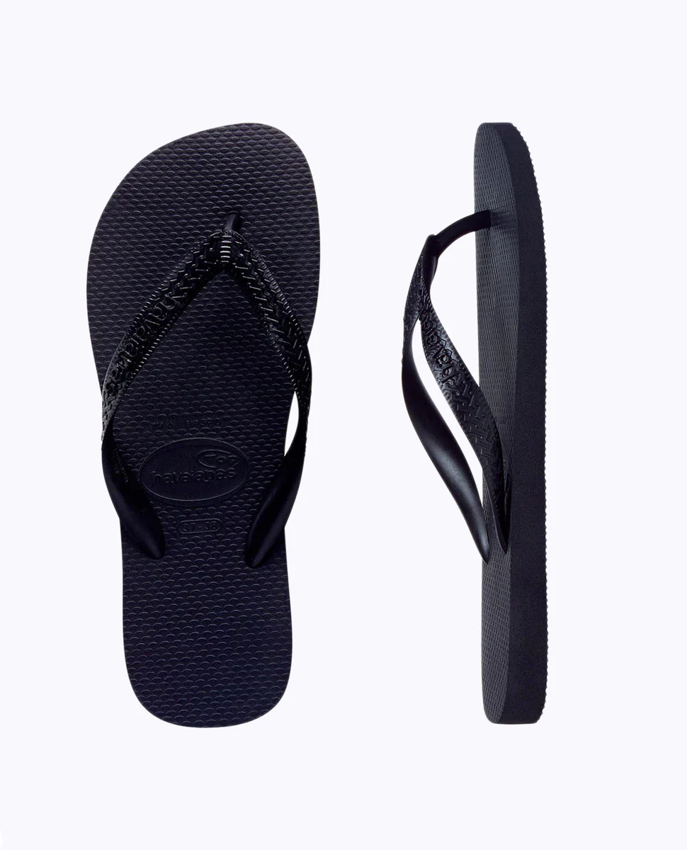 Havaianas Kids Top Black Thongs. In classic colour blocked kids Havaianas in sleek black. An essential summer style accessory constructed from our secret Brazilian rubber formula for the best in comfort and all over colour!